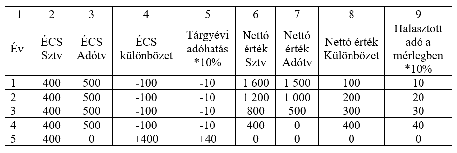Megjegyzés: Ha a példánkban a számvitelben meghatározott leírási kulcs 25 %, az adótörvény szerinti leírási kulcs pedig 20 % lenne, akkor az első négy évben a terv szerinti értékcsökkenésnek – mint adóalap módosító tételnek – kedvezőtlen a hatása lenne az adóalapra, az 5. évben pedig visszaforduló hatása lenne, mert összevontan 400 eFt-tal csökkentené az adóalapot. Ebből következően az 1. év végén 10, a 2. a 3. és a 4. év végén további 10 halasztott adókövetelést kellene elszámolni és így az 5. évben összesen 40 halasztott adókövetelést kellene visszavezetni.