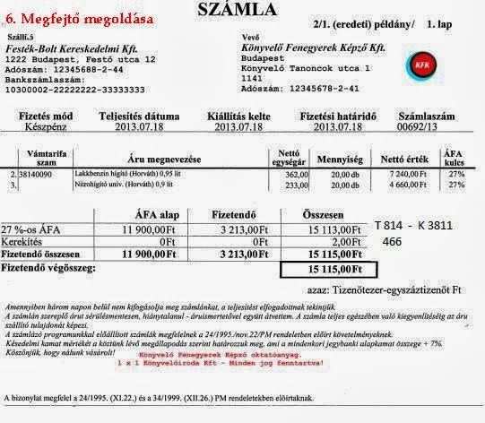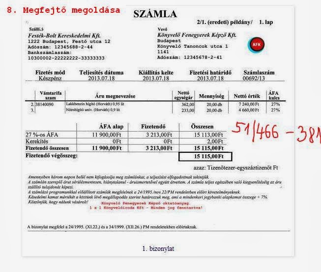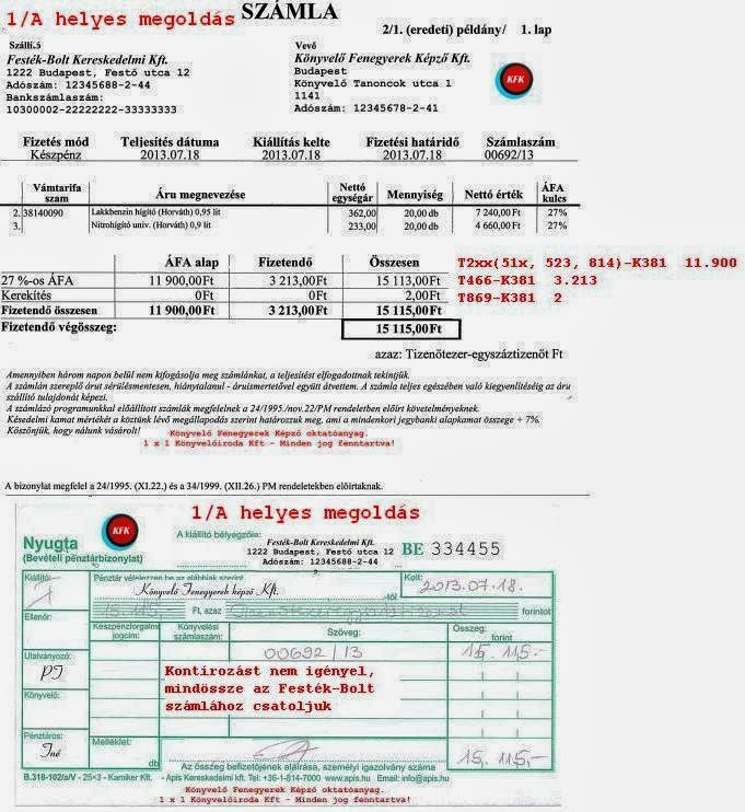 1. Bizonyára tudod, hogy számlázáskor legalább egy eredeti és akár több számlamásolat készül. Az eredeti példány mindig a vevő tulajdona. Mivel a Festék-Bolt-os számla eredeti bizonylat, ezért ez a példány a Könyvelő Fenegyerek képző Kft példánya. Attól függően, hogy a KFK mire használja a vásárolt hígítót, stb a következőképpen könyveljük: