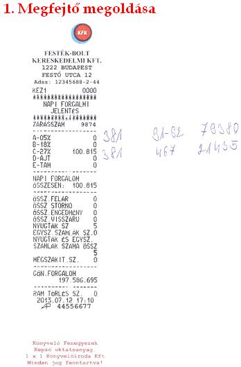 2. A 2 bizonylaton a Festék-Bolt Kereskedelmi Kft egyik pénztárgépének a napi forgalmának az összesítőjét láthatod – ez a napi forgalmi jelentés. A pénztárgépben rögzített árbevétel könyvelésének mindig ez az alapbizonylata. Ennek a bizonylatnak a helyes kontír tétele: T381-K911, 467