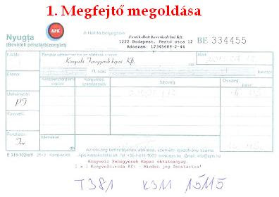 Mivel a 3. bizonylatként csatolt nyugta pont a Festék-Boltos ügylethez tartozik és a 3 példányos bevételi pénztárbizonylat (eredeti, nyugta és tőpéldány) Nyugtája mindig a vevő példánya, jelen esetben a KFK-é, ezért a nyugtát nem kell kikontíroznunk, azt mindössze a Festék-Boltos számlához csatoljuk. Ilyenkor a csatolt nyugta igazolja a számla ellenértékének a kifizetését. A helyes kontírozást az 1/A megoldás mutatja.